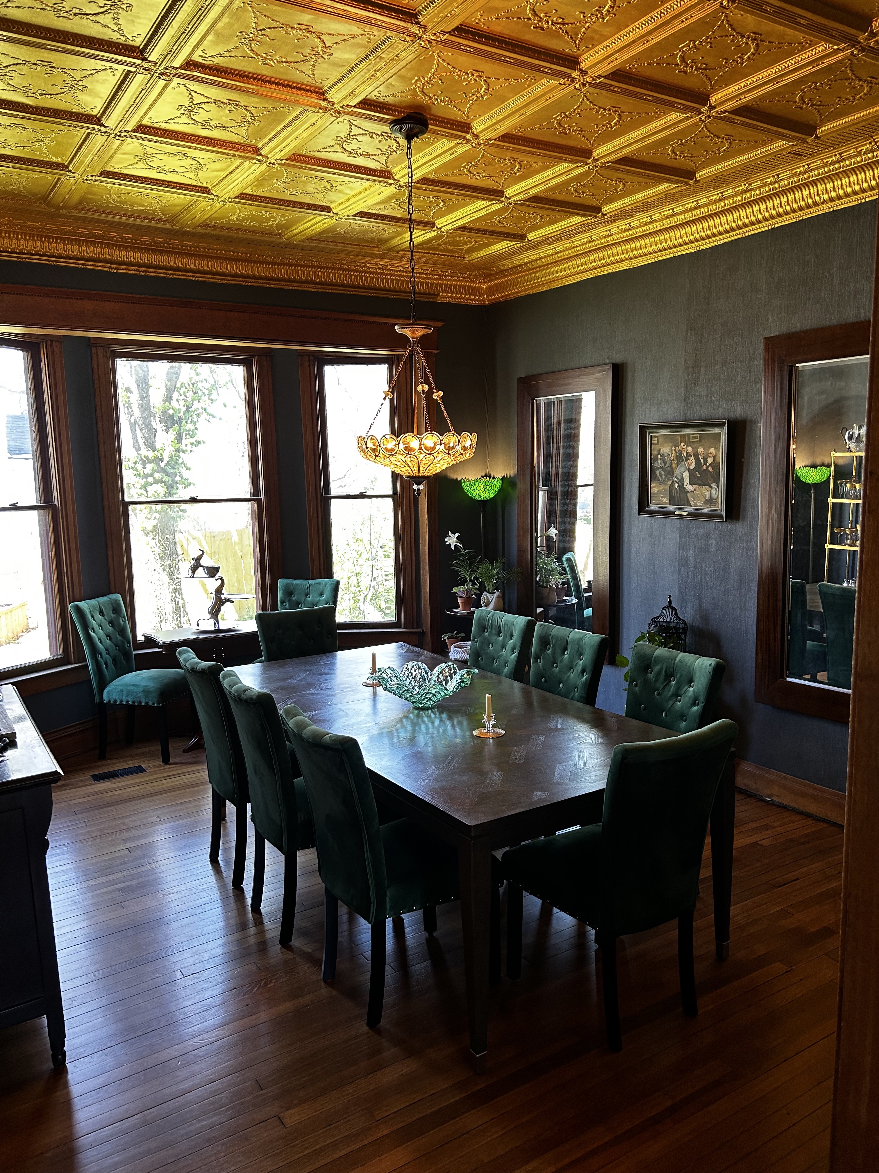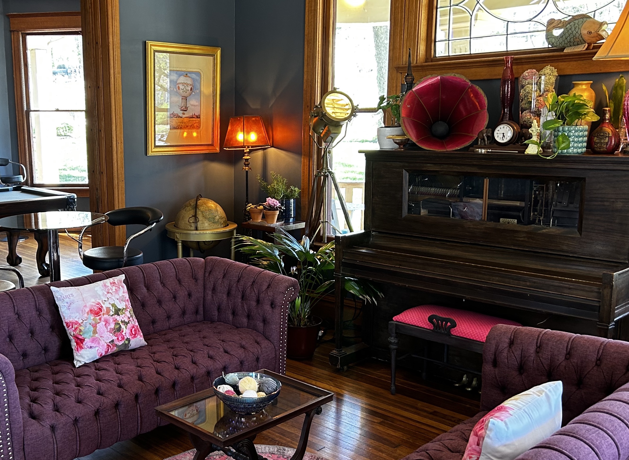 Enjoy a game of pool with the cozy fireplace in our billiards library, settle in for a glass of wine and gossip in the built-in benches of the front tower, make a memory with a selfie on the grand staircase, or crank up the antique player piano.
